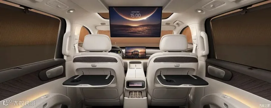 新车还配备10.25 英寸液晶仪表+17.3英寸中控屏+6英寸后排多功能控制屏+21.4 英寸3K电动娱乐屏。其他配置方面,新车将拥有120度躺姿零重力座椅、车载制氧机、夹层隔音玻璃等配置,空间上则拥有5座、6座、7座多种布局组合。全电动车规级冷暖冰箱,8.1L大容量,可装载9瓶380ml矿泉水,-6°C至50°C宽温域调节,支持语音与APP远程电动开闭。