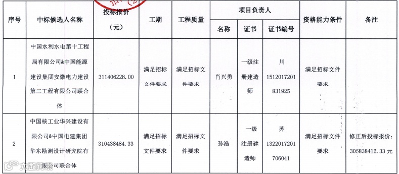 中标候选人第2名:中国核工业华兴建设有限公司&中国电建集团华东勘测设计研究院有限公司联合体,投标报价306838412.33元(修正后投标报价),折合单价约为:1.70元/W;