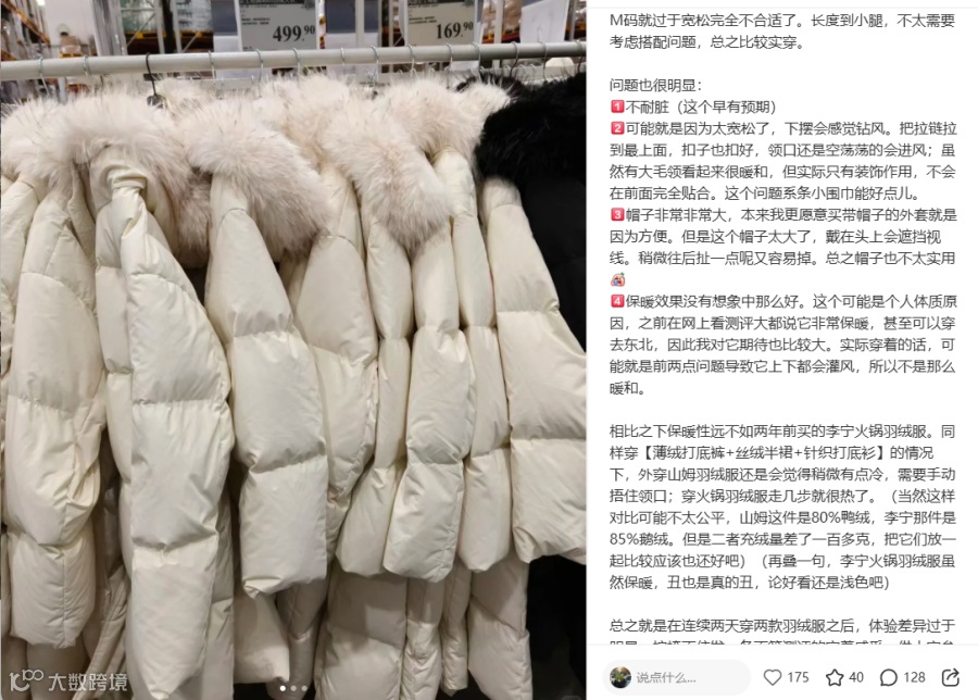 一位购买了山姆400克羽绒服的消费者在社交平台反馈:“保暖效果没有想象中那么好。”因版型宽松原因,实际穿着中会“上下灌风”,“所以不是那么暖和。”
