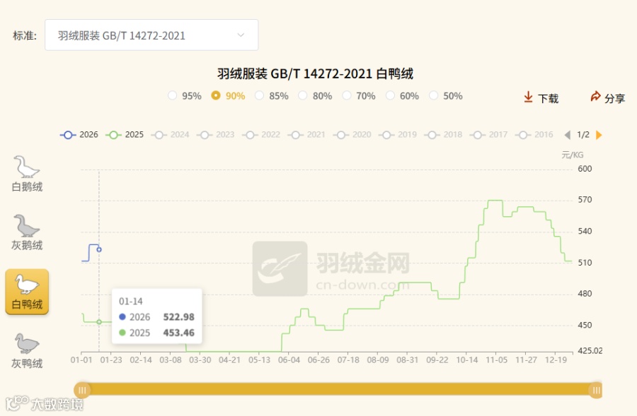 记者查询第三方检测平台数据发现,截至1月14日,羽绒服装GB/T14272-2021白鸭绒报价为522.98元/公斤,较2025年初的461.36元上涨约13%。