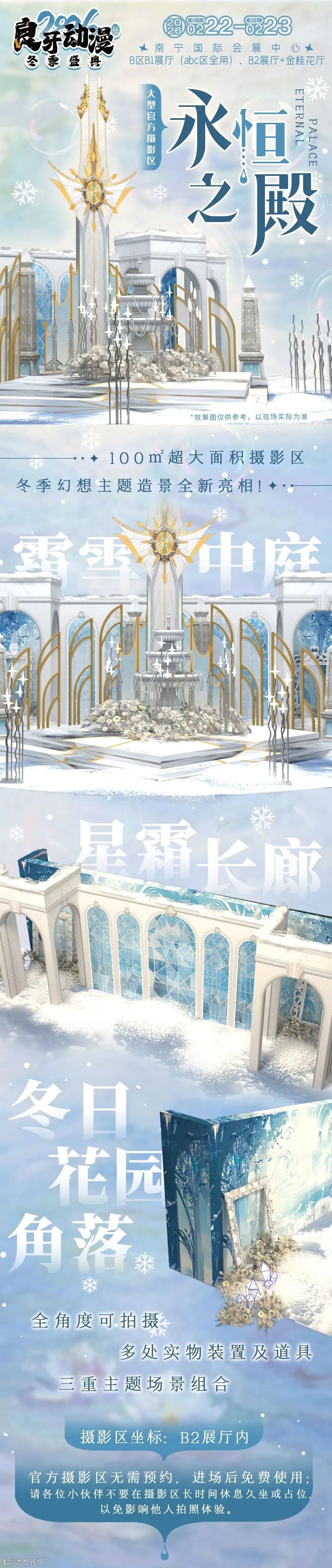 由霜雪中庭x星霜长廊x冬日花园角落三个主题拍摄区域组成,每日10:00-11:00和15:00-16:00是摄影区的“下雪”时刻,来拍照吧~