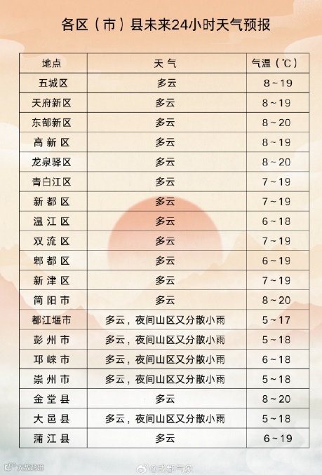 预计从今晚至26日白天,成都市以多云到晴天气为主,气温明显回升,26日最高气温可达27℃。