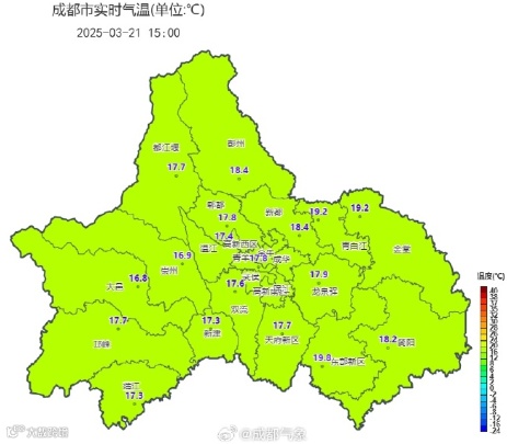 截至今日15时,成都全市气温普遍在18℃左右,春意渐浓。未来几天气温将持续上升,白天最高气温将逐步升至20℃、23℃、24℃。