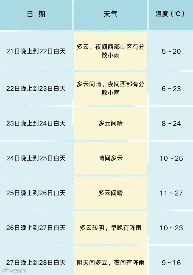 - 21日晚上到22日白天:多云,夜间西部山区有分散小雨,气温5~20℃;主城区多云,气温8~19℃。