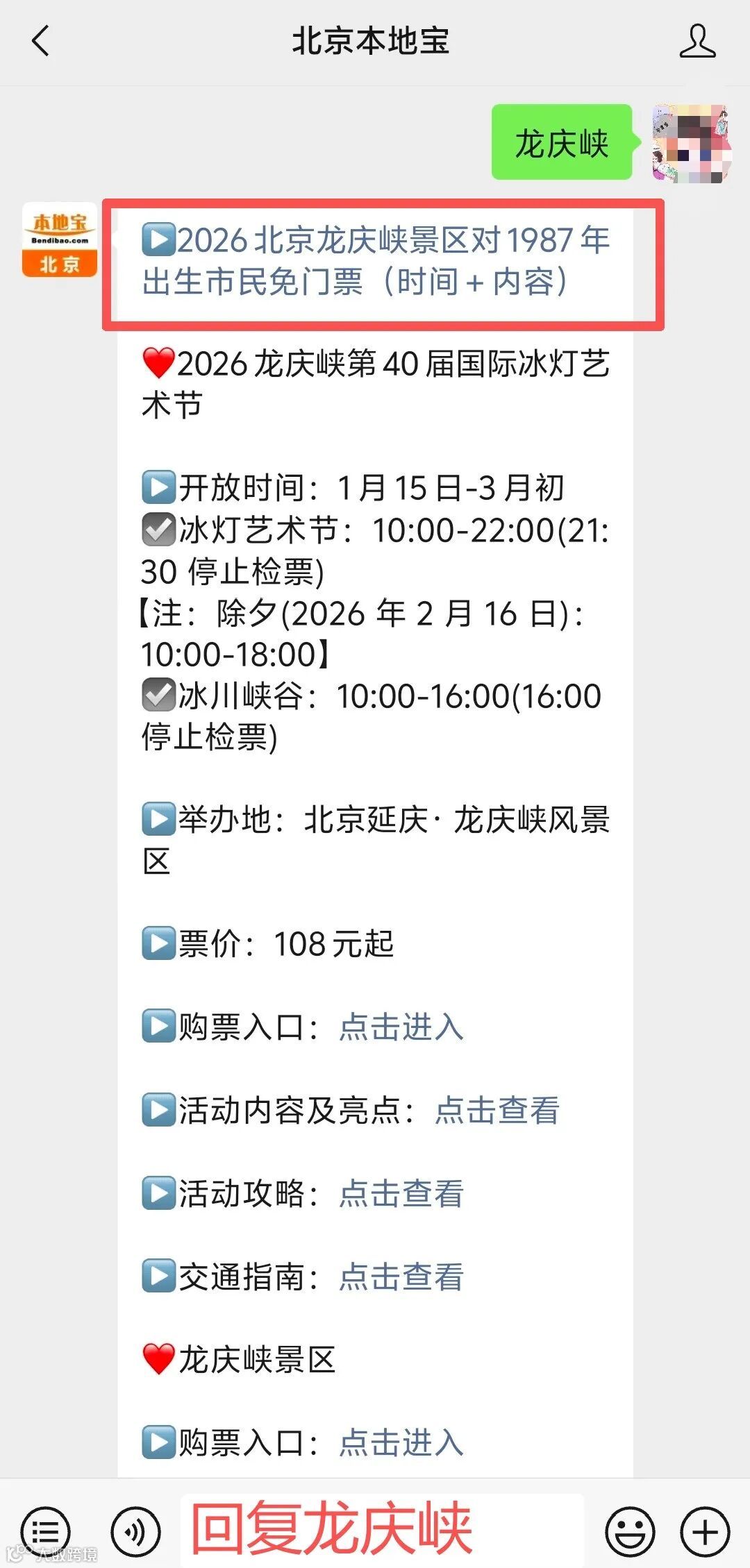 小编有话说:您扫描下方二维码,也可以关注【北京本地宝】公众号,聊天对话框发送【龙庆峡】获取购票入口、游玩指南、福利政策等