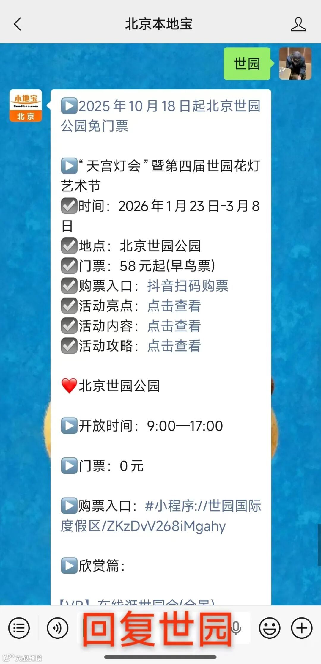 关注【北京本地宝】微信公众号,微信对话框回复【世园】,可获取购票入口
