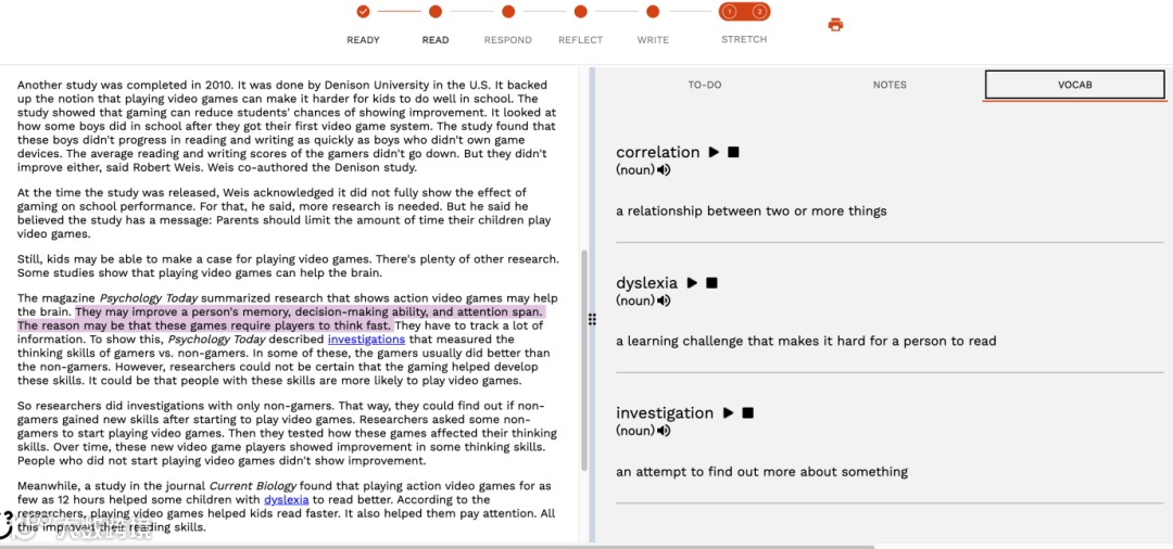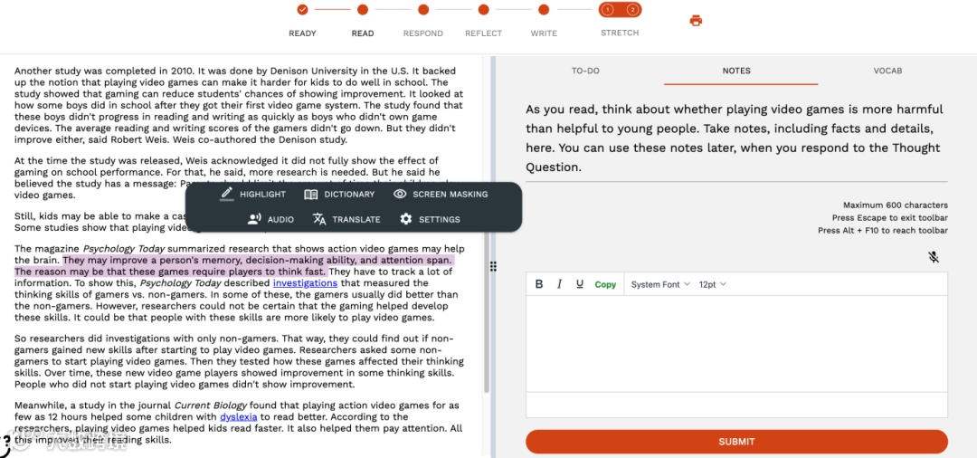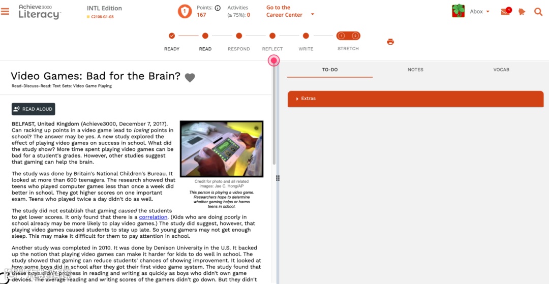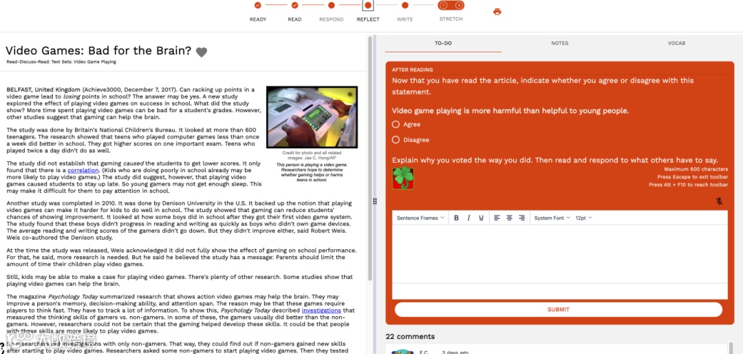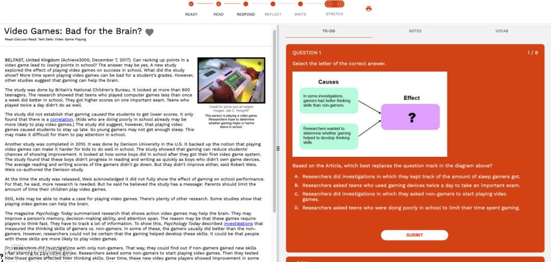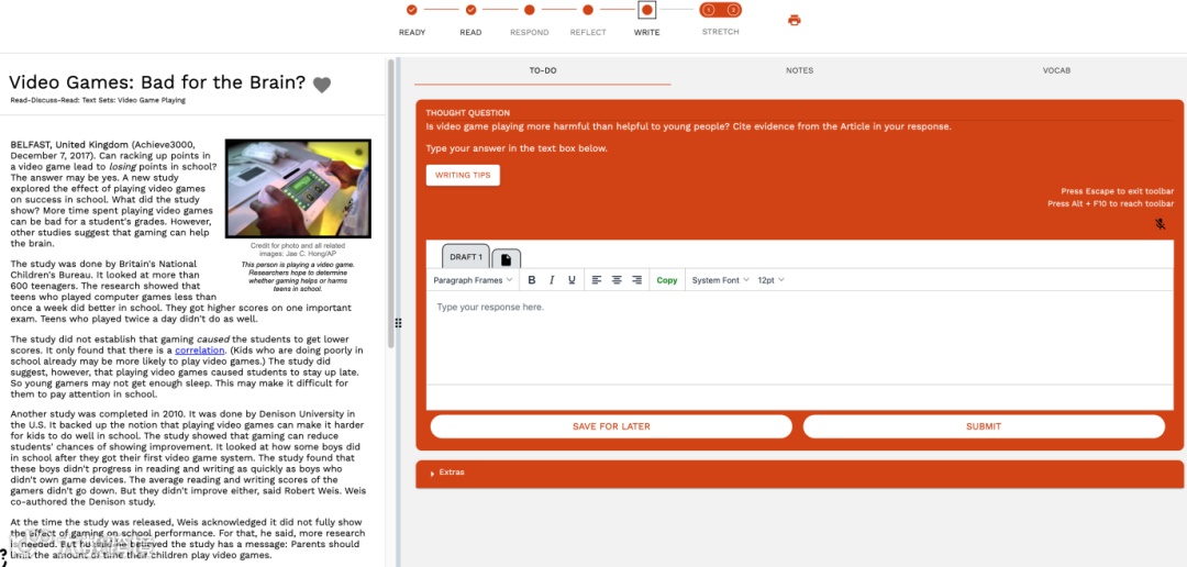 新版的Achieve3000里的文章大部分依旧为"5-step Lesson"五步学习法,但将阅读理解和写作练习完美的融合在了一起。