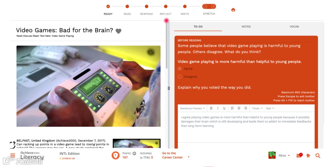 写作也是Achieve3000系统里很重要的部分,每篇文章的五步学习法里,Ready、Reflect、Write都牵涉到写作。