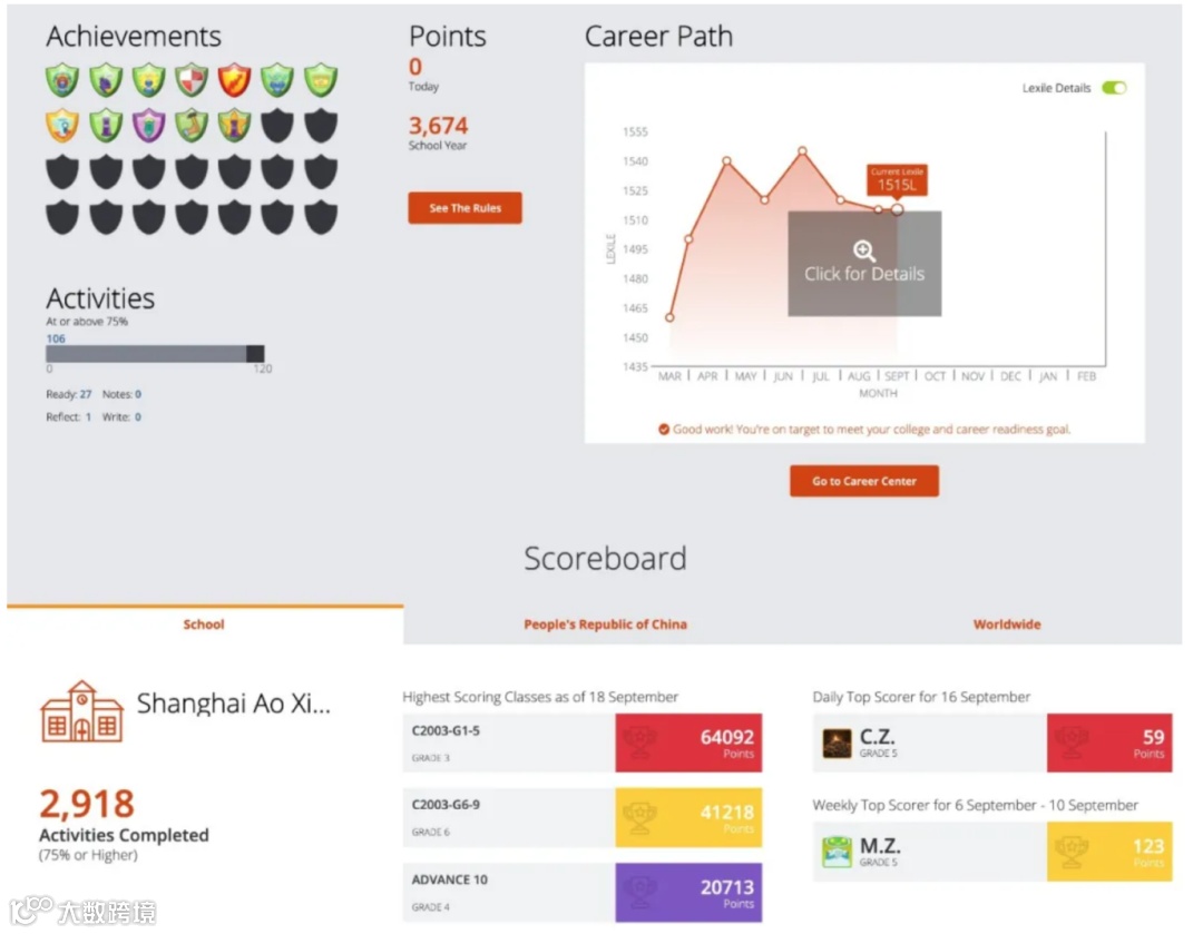 Achieve3000有家长账号,通过家长账号,爸爸妈妈们可以看到孩子学习的全部情况,包括读了哪些文章、具体都做了哪些练习、阅读理解能力表现如何,以及现在的蓝思值和使用系统以来的蓝思值变化等等。