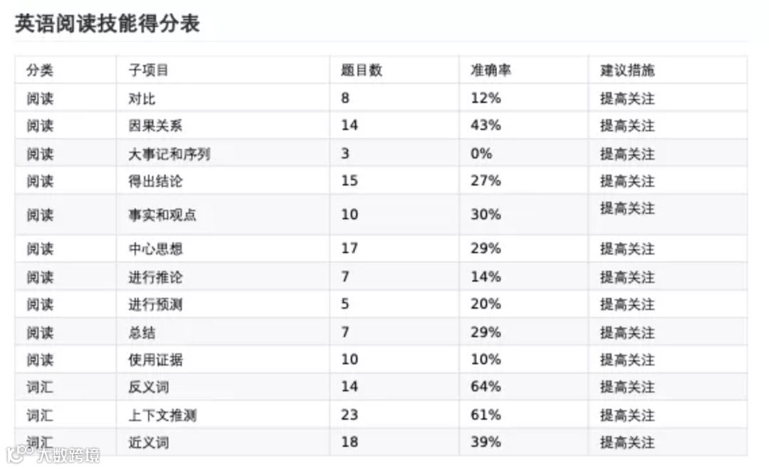 这对家长来说,可能是最有用的部分了,在这里,你可以清楚的看到孩子阅读理解的薄弱环节在哪里,可以针对孩子的薄弱项增加额外的推送练习。