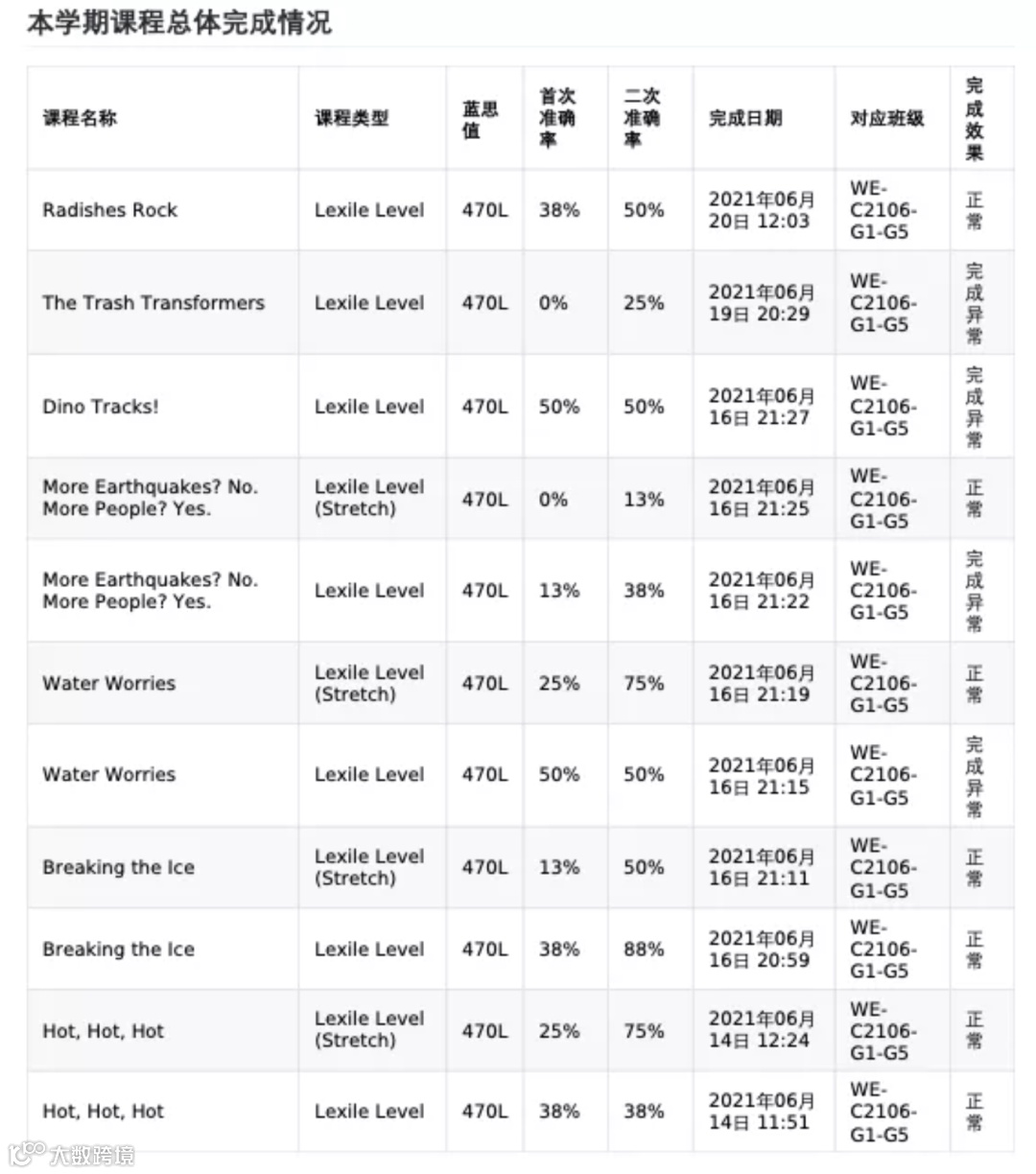 在这个部分,家长可以看到自从使用Achieve3000系统以来,孩子做过的所有的文章和Activity的答题准确率情况。并提供统计数据:本学期总计完成有效课程(不包含延展类型)共多少篇,平均每周做了多少篇;学期初始兰斯值和目前的兰斯值各是多少。