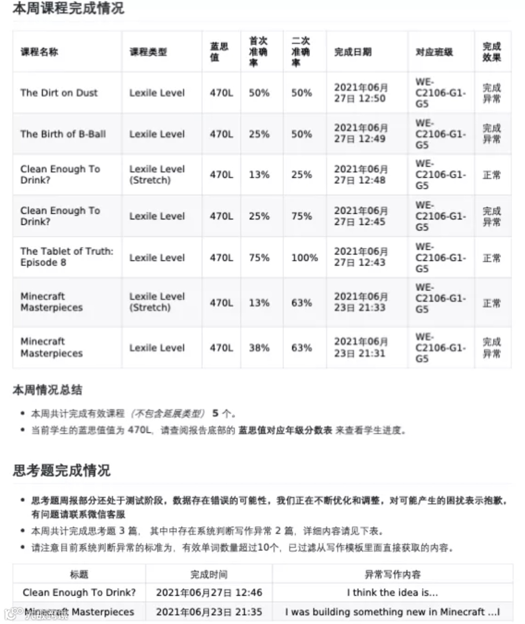这部分说明了学生在统计时间内,完成的阅读文章明细,Respond首次和二次完成的准确率,和“Write”部分的完成情况。