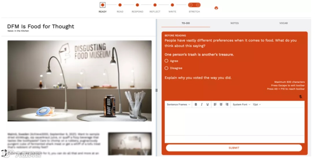 Achieve3000这套系统也采用了这个经典的学习方法,通过投票题或者问答题,帮助学生关注他们将会阅读的内容,让他们在开始阅读前就开始积极地思考,这就是第一步,阅读之前的Ready部分。