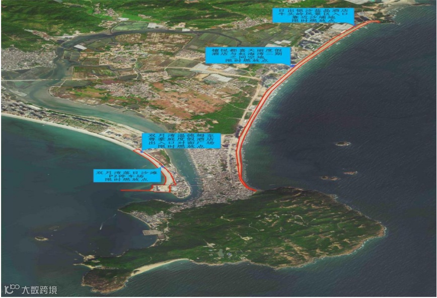 港口滨海旅游度假区限时可燃区域:东山海和沙咀尾靠近沙滩沙浦地附近划定4个空旷沙滩区域(日出银沙盐晶酒店牛头岭风景区入口靠近沙浦地区域;檀悦都喜天丽度假酒店与虹海湾二期之间空地;双月湾温德姆至尊豪庭度假酒店出入口对面广场;双月湾落日沙滩P2停车场对出沙浦地区域)定为限时可燃放区;