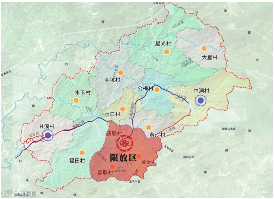东面由武深高速江厦段至武深高速龙门立交,南面由武深高速龙门立交至县污水处理厂至S353线水贝出口至城西村Y294路口至围心村,西面由围心村至县龙新路办公区,北面由县龙新路办公区至花围村委罗江村小组猪肚湖路口至武深高速江厦段(详见区域图,红线范围内为禁止区域)。