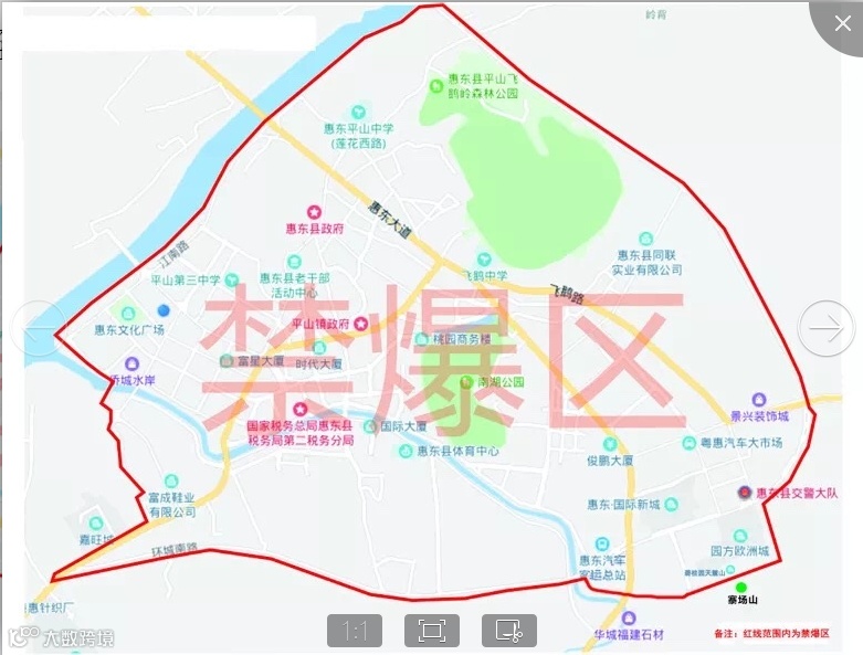 东至环城北路、县林业局办公楼、粤惠和谐小区;南至环城南路、寨场山;西至西枝江、河北二路、青龙大道、新平大道至环城南路交汇处;北至环城北路、三联大桥(详见禁爆范围示意图)。