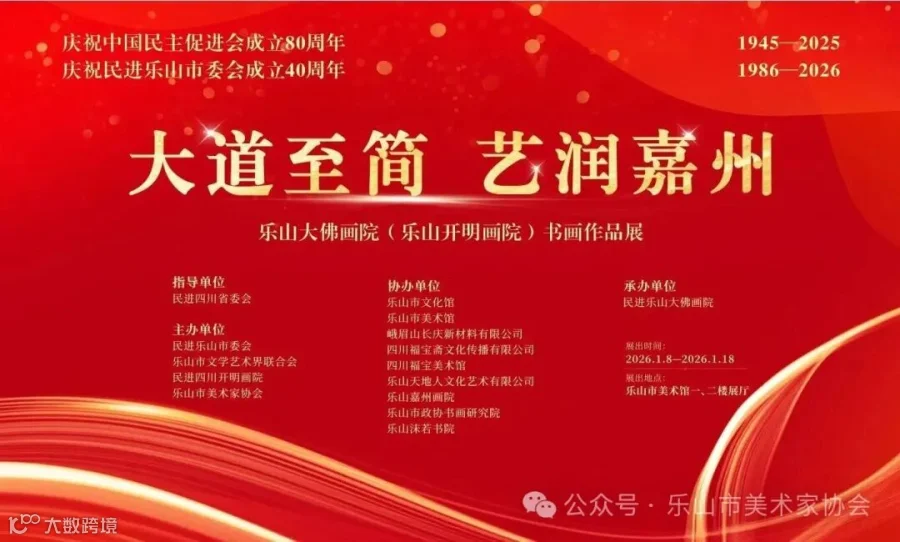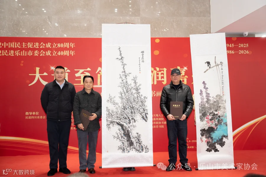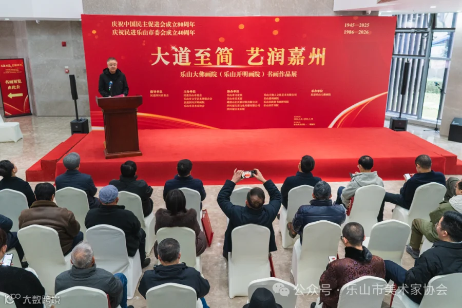 1月8日,由民进乐山市委会、乐山市文学艺术界联合会、民进四川开明画院、乐山市美术家协会主办,民进乐山大佛画院承办的庆祝中国民主促进会成立80周年、民进乐山市委会成立40周年——“大道至简・艺润嘉州”书画作品展正式开幕。民进四川省委会专职副主委向东,乐山市人民政府副市长、民进乐山市委会主委毛剑,中共乐山市委统战部常务副部长吉春林,民进乐山大佛画院执行院长、民进乐山市委会原副主委李开能出席开幕式并致辞。