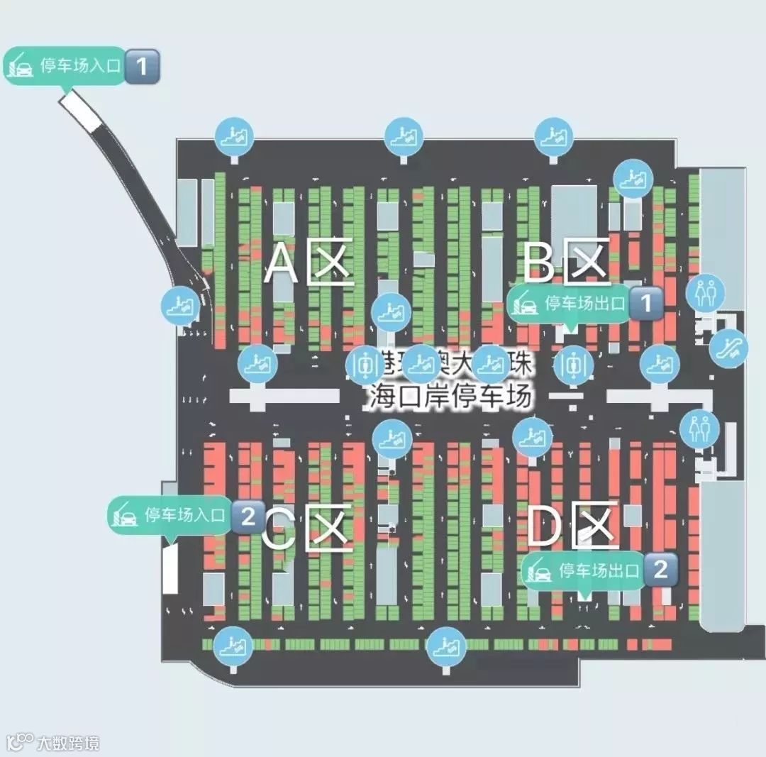 港珠澳大桥珠海口岸地下停车场位于港珠澳大桥珠海口岸交通中心负一楼,分为A、B、C、D四个区域,合计共有1,400余个停车位。口岸地下停车场西侧设有两个入口,北侧有两个出口,均为双车道通行,限高2.2米。