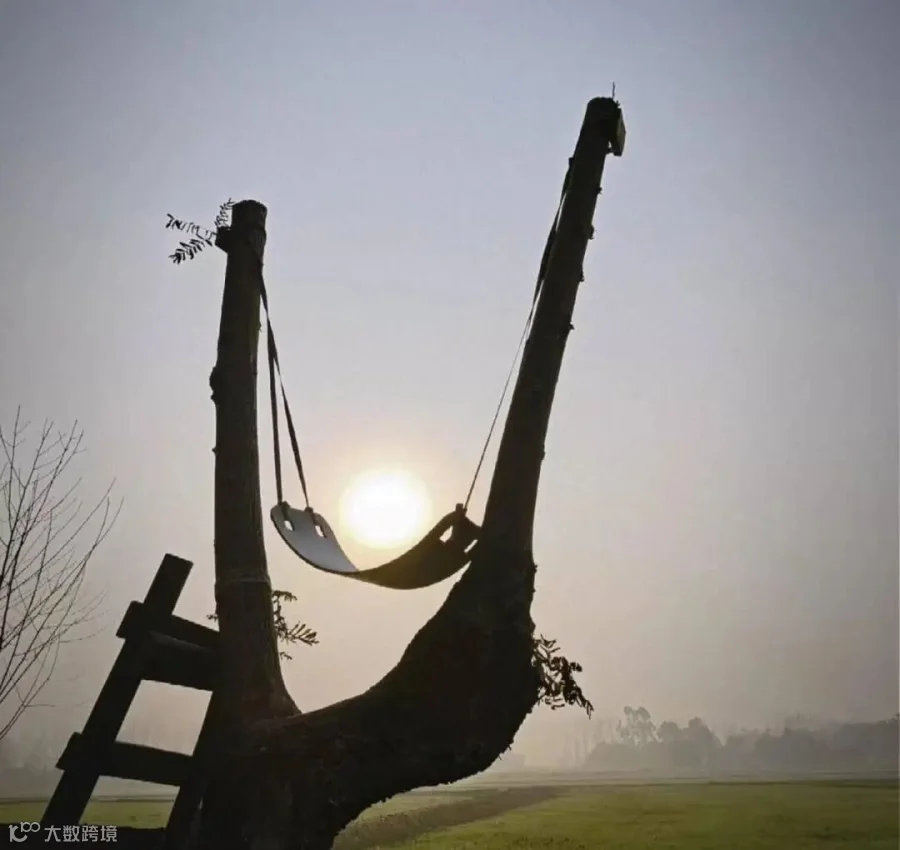 一架原木秋千,稳稳兜住落日碎光
