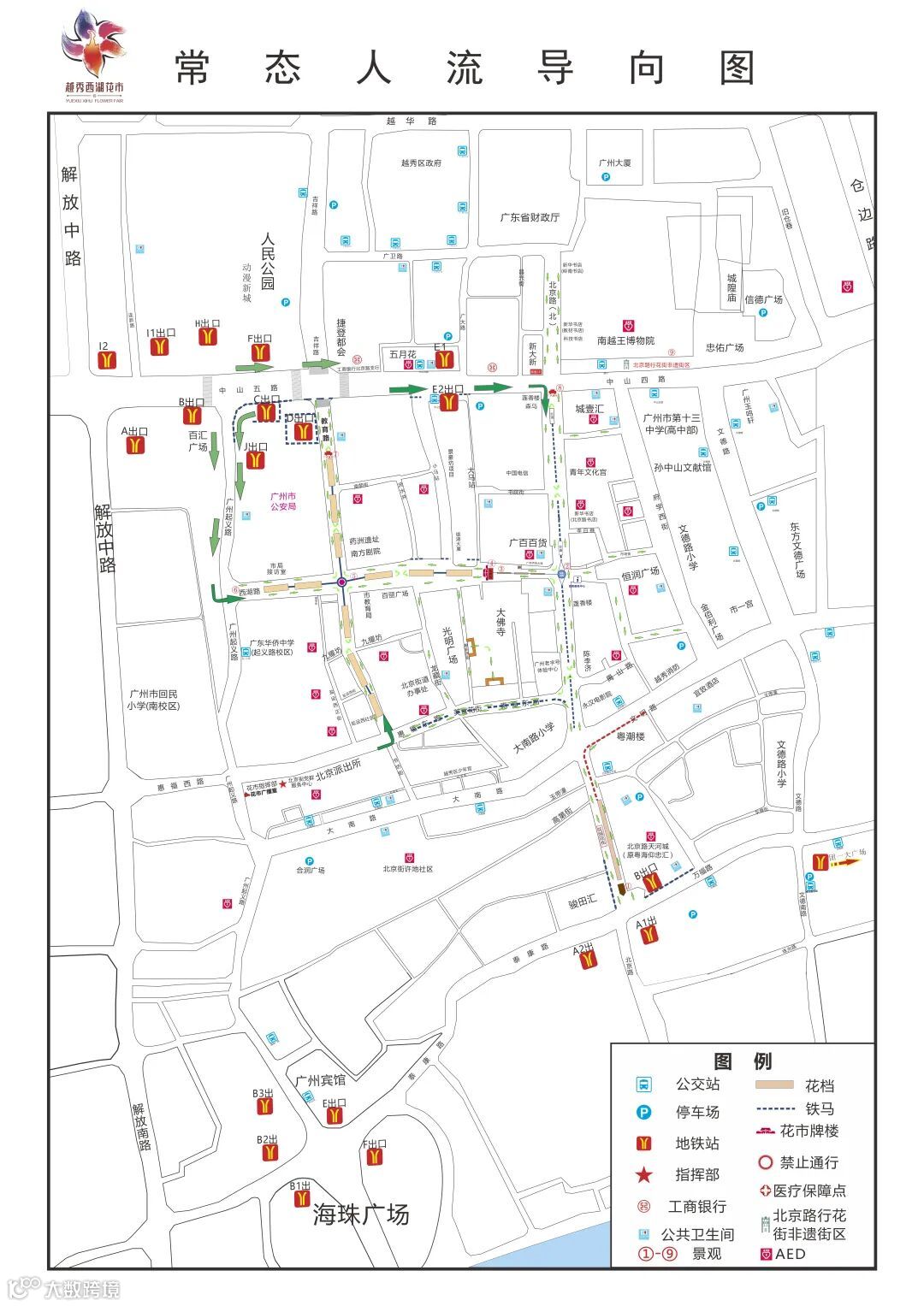花市期间,公园前站、北京路站各出口视客流情况采取限制分流措施,保障客流平稳有序。