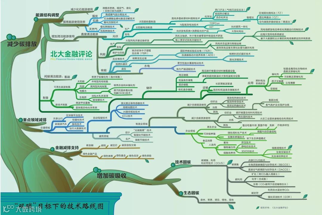 近日,《北大金融评论》发布“双碳”目标下的技术路线图,涵盖减少碳排放和增加碳吸收两大路径。其中,减排路径包括能源结构调整、重点领域减排和金融支持;增汇路径则包含技术固碳与生态固碳。