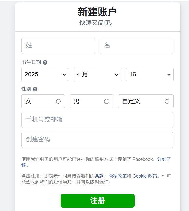 - 邮箱或手机号:建议使用Gmail、Outlook等国际邮箱服务,避免使用国内邮箱。大陆手机号也可以注册Facebook。