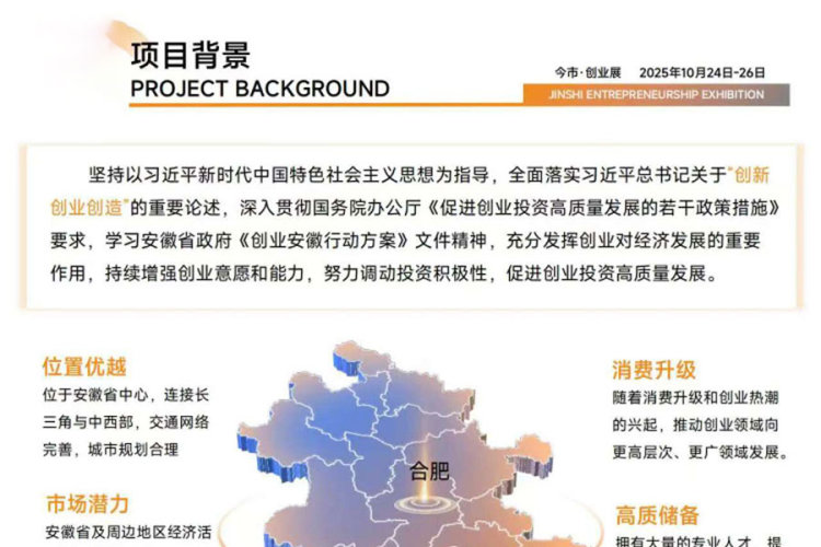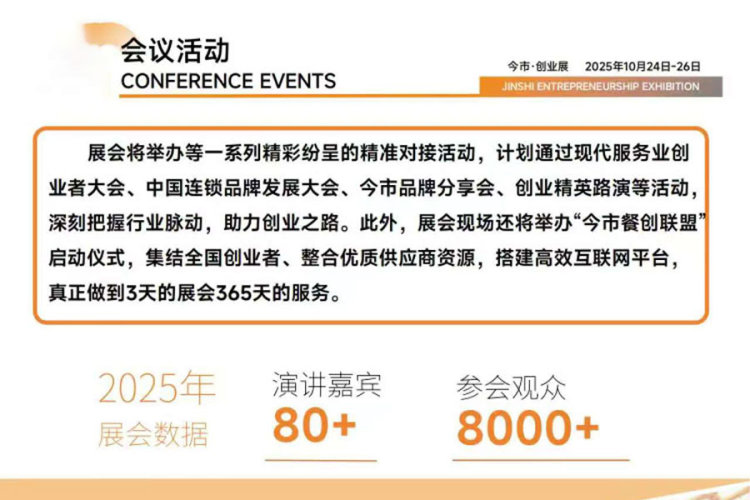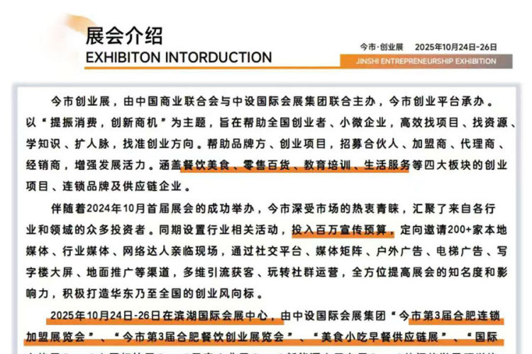 2025年10月24日-26日在滨湖国际会展中心,由中设国际会展集团“今市第3届合肥连锁加盟展览会”,“今市第3届合肥餐饮创业展览会”,“美食小吃早餐供应链展”、“国际文旅展”、“中国好礼展”、“民宿产业展”、“新能源专用车展”、“休闲旅游及研学旅游展”、“游乐设备及光影设备展”、“社区服务业及公共文化设备展”共计10个展会项目联展,计划展出面积达7万。,同档期现场展览项目共计12万㎡。此次联展优势显著,多展联动实现资源整合共享,展商能突破行业局限,接触跨领域客户与伙伴,拓宽业务渠道,一站式将吸引大量专业观众和消费者,极大提升展品曝光度与品牌影响力。