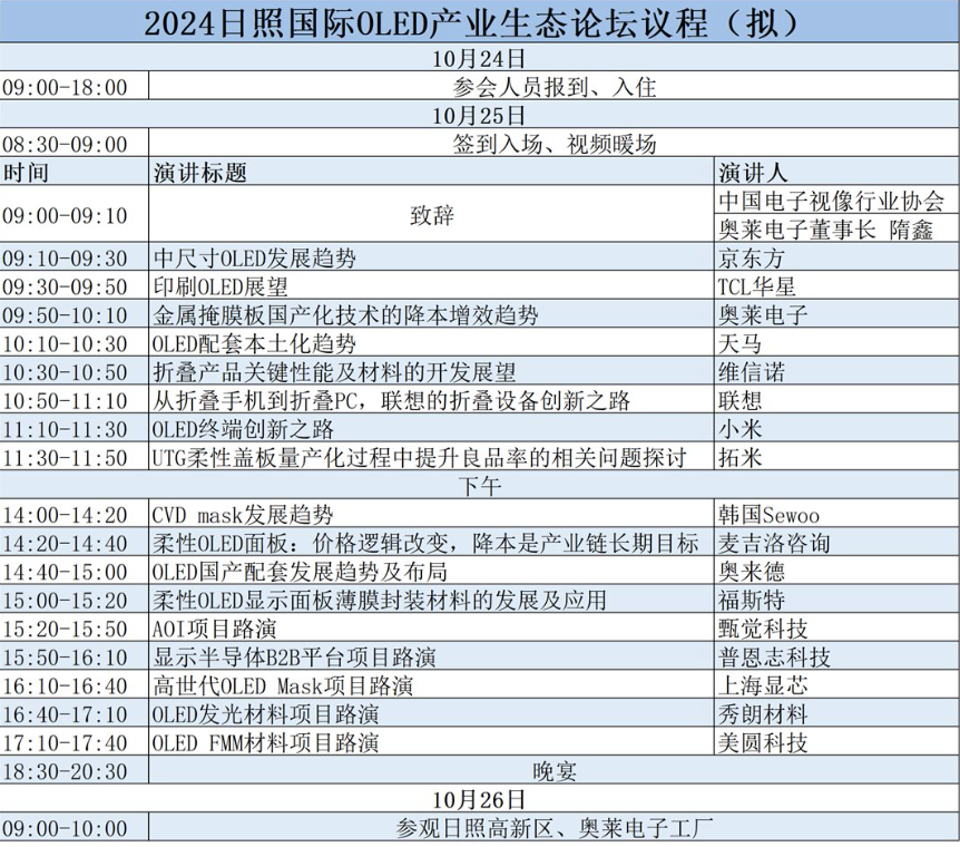 为了进一步强化日照显示产业布局,促进全球AMOLED领域技术创新,加强全球AMOLED技术交流与合作,加速AMOLED产业链创新、突破,在中国电子视像行业协会OLED显示产业分会、中国电子视像行业协会柔性电子产业分会指导下,WitDisplay联合产业链企业特别筹划了“2024日照国际OLED产业生态论坛”,拟定于2024年10月25日在日照盛大召开,论坛拟围绕AMOLED全产业链,研讨创新发展;邀请AMOLED相关专家、知名企业家、主导企业参加演讲活动,搭建AMOLED行业及相关领域企业交流合作平台,打造具有影响力的行业盛会,加快全球AMOLED技术创新和产业应用!