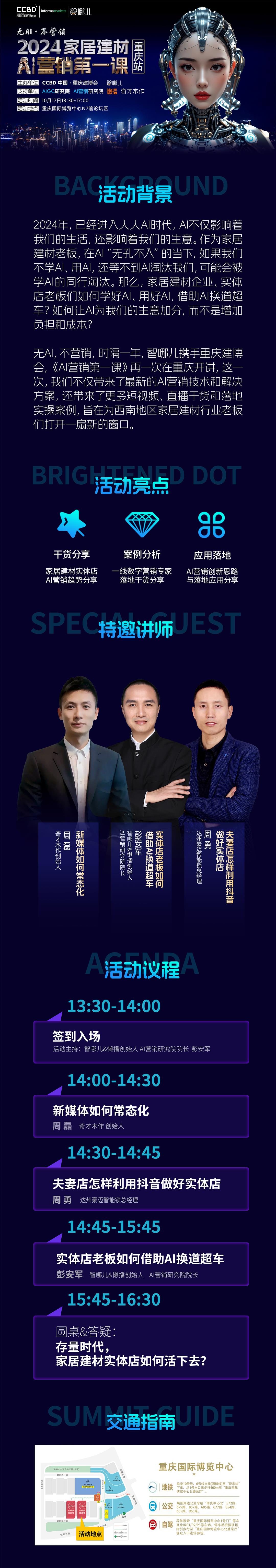 无AI,不营销,时隔一年,智哪儿携手重庆建博会,《AI营销第一课》再一次在重庆开讲,这一次,我们不仅带来了最新的额AI营销技术和解决方案,还带来了更多短视频、直播干货和落地实操案例,旨在为西南地区家居建材行业老板们打开一扇新的窗口。