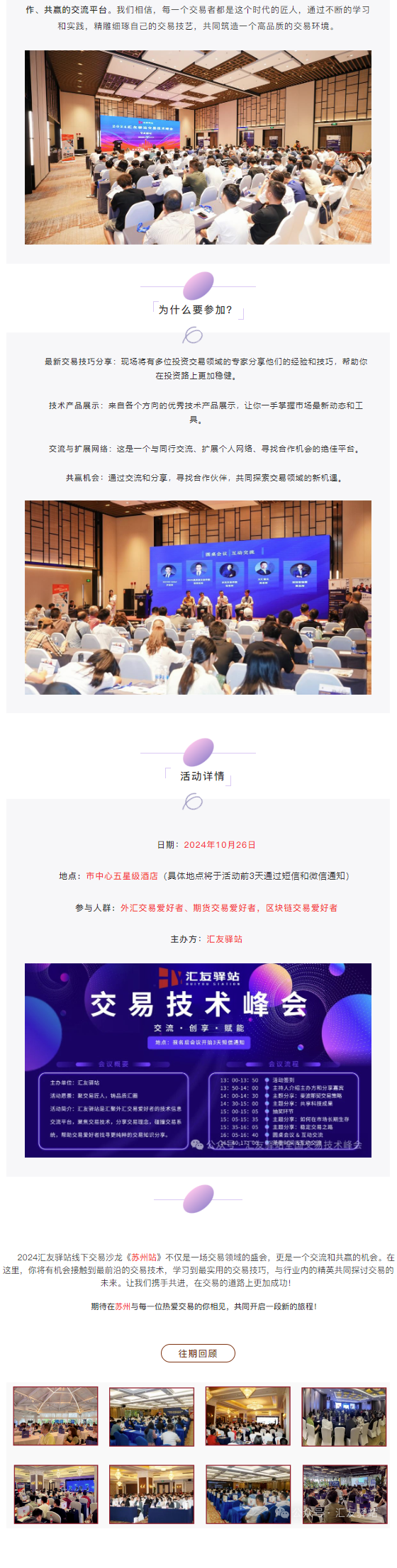 2024年,汇友驿站交易技术峰会《苏州站》将于10月26日在苏州举办,旨在为广大投资者和交易者提供一个深度交流、共同学习的平台。我们坚信,通过聚集行业内的精英与技术革新者,我们可以共同推动交易领域的发展,实现共赢。