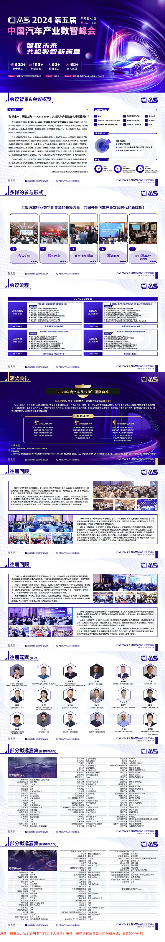 CIAS 2024不仅是一个交流思想、碰撞火花的平台,更是一个推动汽车产业数智化创新发展的重要力量。诚邀业界人士参与本次峰会,通过本次峰会的深入交流与合作,将加速汽车产业的智能化与数字化进程,为构建更加智慧、绿色、可持续的汽车生态系统贡献力量,共同开创数智时代汽车产业新篇章!