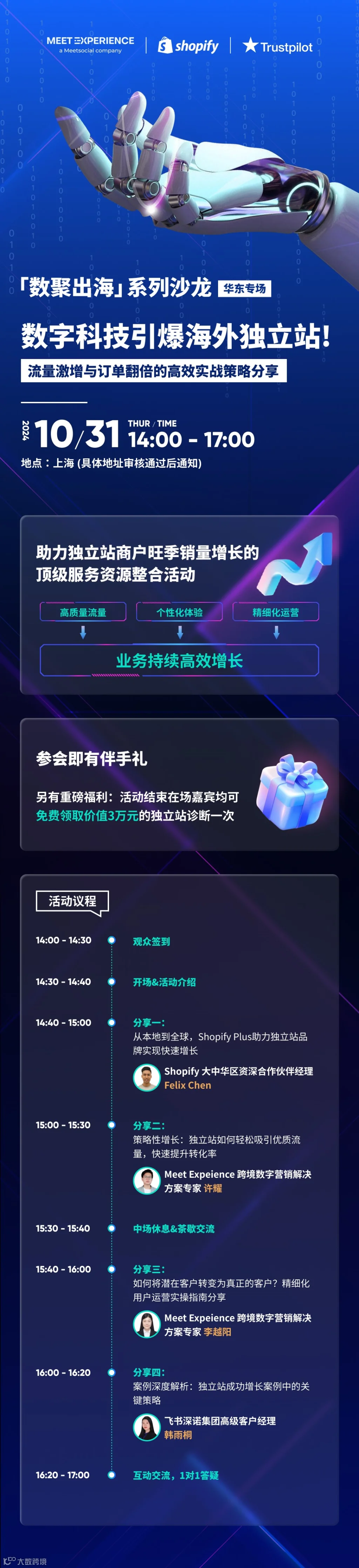 专属互动福利:享受1对1问答机会,并有机会赢得价值3万元的独立站免费诊断服务。