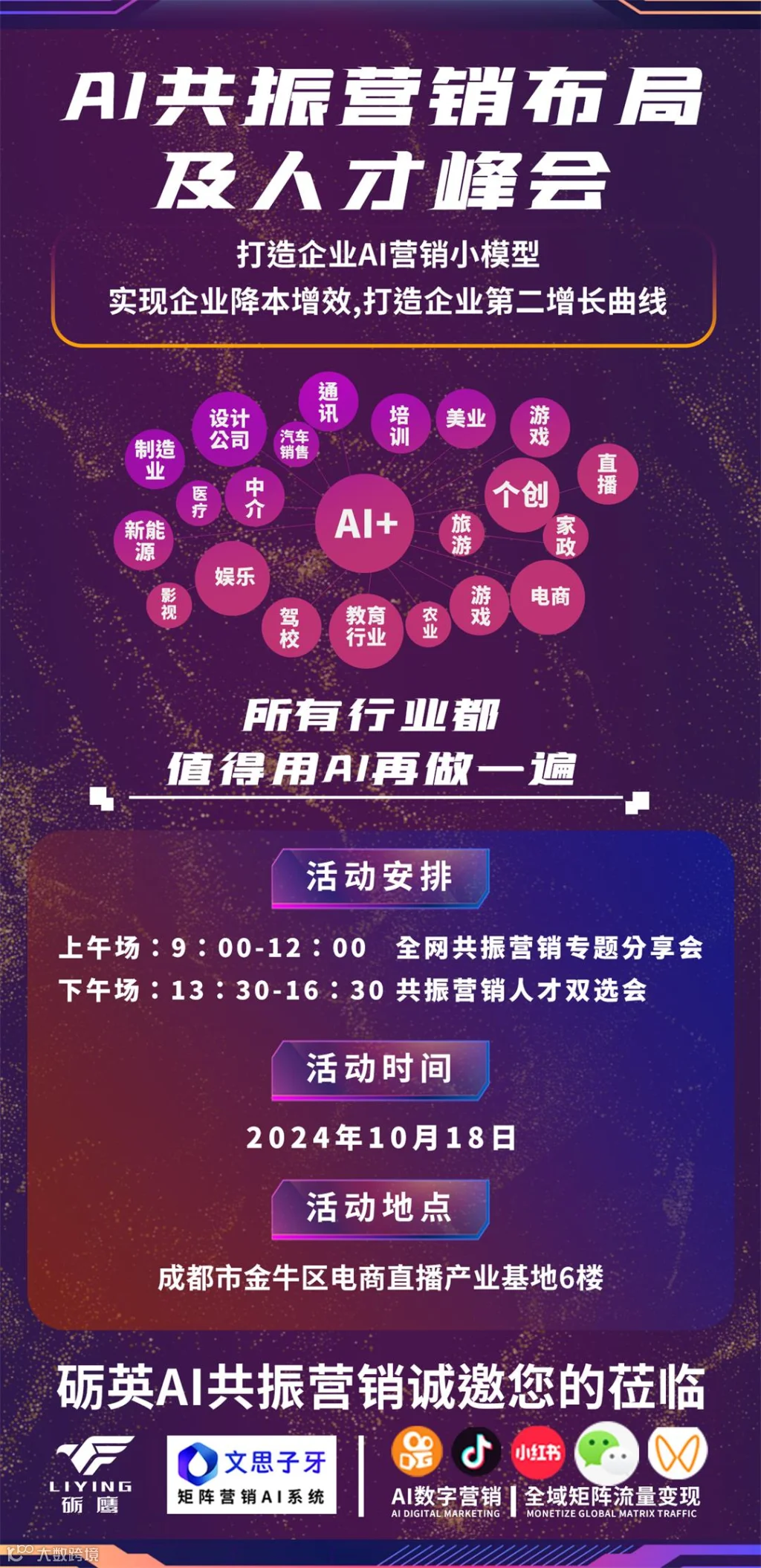 2024年10月18日,砺鹰教育将在成都市金牛区开展关于AI共振营销,短视频营销的线下沙龙活动,结合人才招聘,为企业带来如何降本增效,即时变现的营销策略,期待您的加入