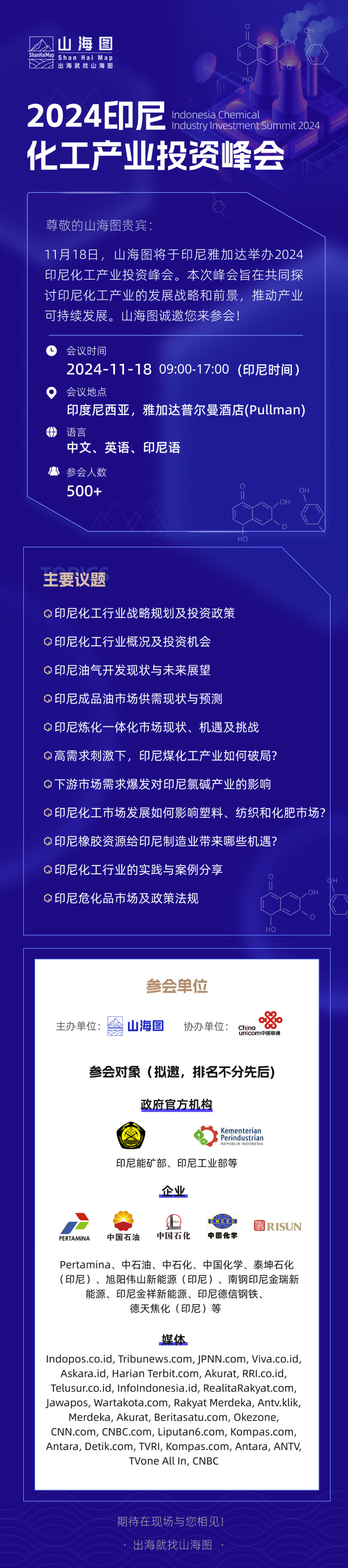 尊敬的山海图贵宾:11月18日,山海图将于印尼雅加达举办2024印尼化工产业投资峰会。本次峰会旨在共同探讨印尼化工产业的发展战略和前景,推动产业可持续发展。山海图诚邀您来参会!
