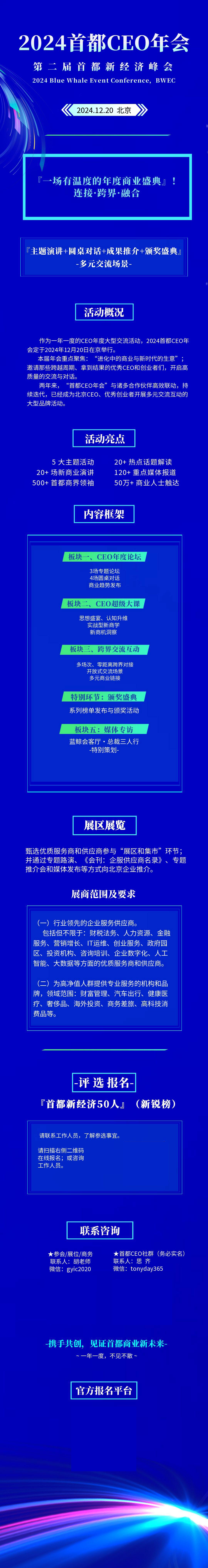 作为一年一度的首都CEO年度大型交流活动,2024(第二届)首都CEO年会定于2024年12月20日在京举行。本届年会重点聚焦:“进化中的商业与新时代的生意”,邀请那些跨越周期、拿到结果的优秀CEO和创业者们,开展高质量的交流与连接。会议主要设置:主题演讲、圆桌对话,成果推介、颁奖盛典等多元交流场景。