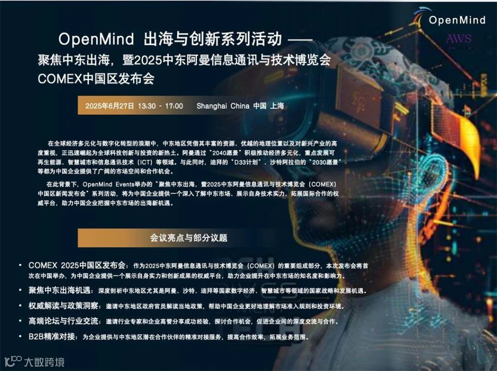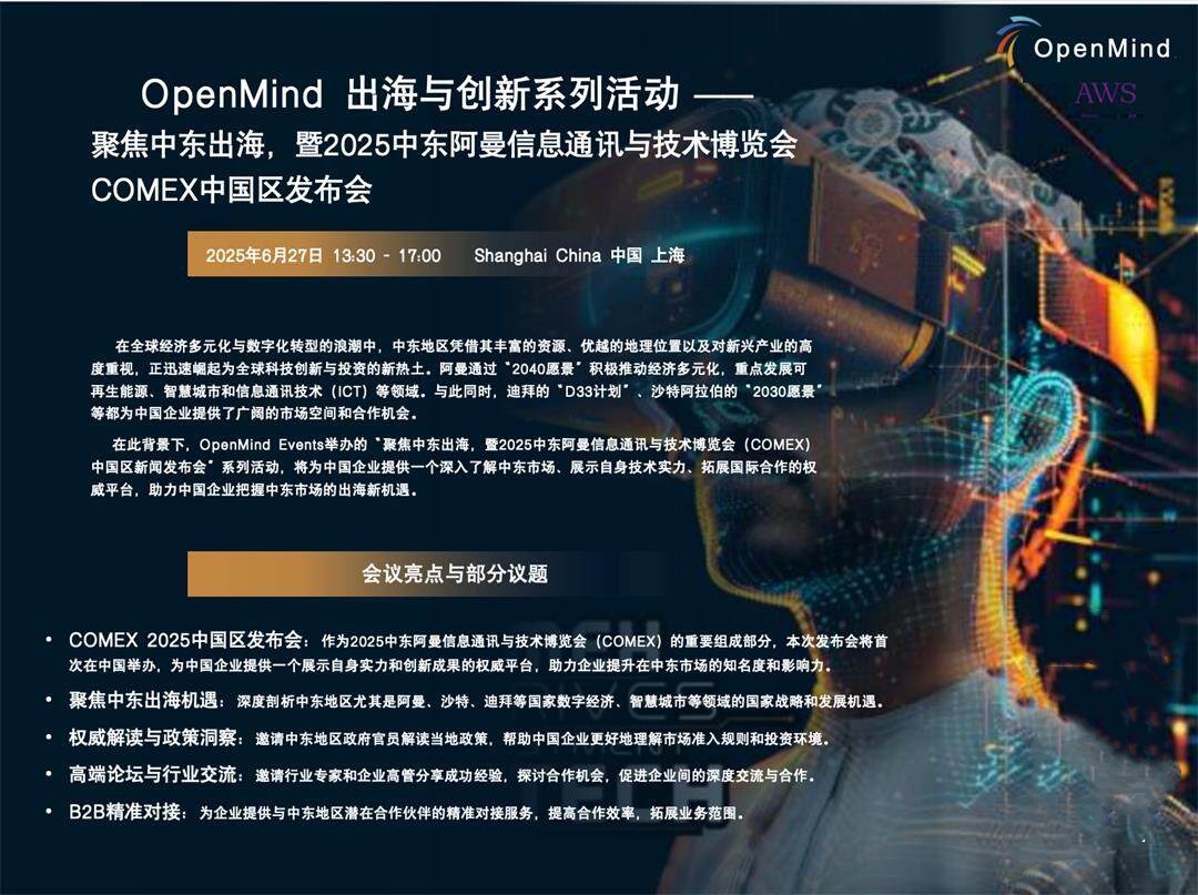 在此背景下,OpenMind Events举办的“聚焦中东出海,暨2025中东阿曼信息通讯与技术博览会(COMEX)中国区新闻发布会”系列活动,将为中国企业提供一个深入了解中东市场、展示自身技术实力、拓展国际合作的权威平台,助力中国企业把握中东市场的出海新机遇。