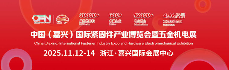2025中国(嘉兴)国际紧固件产业博览会暨五金机电展将于2025年11月12-14日在浙江·嘉兴国际会展中心隆重举行。我们诚挚欢迎来自全球的工业用品领域企业加入2025中国(嘉兴)国际紧固件产业博览会暨五金机电展!