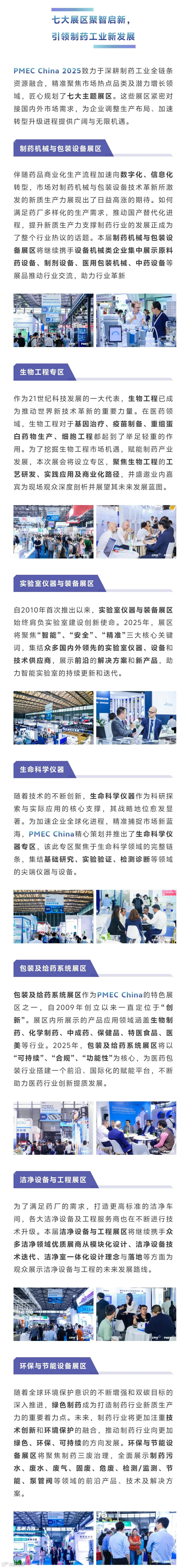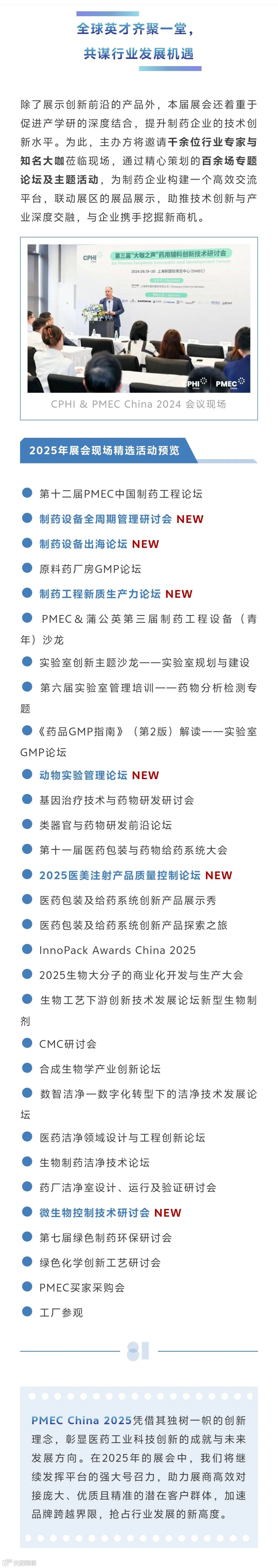 2025年,作为中国医药产业国际化进程上的强劲助力,世界制药机械、包装设备与材料中国展(PMEC China)将携手世界制药原料中国展(CPHI China),以创纪录的展示规模,共同推进全球医药制造装备技术的交流及贸易的发展。
