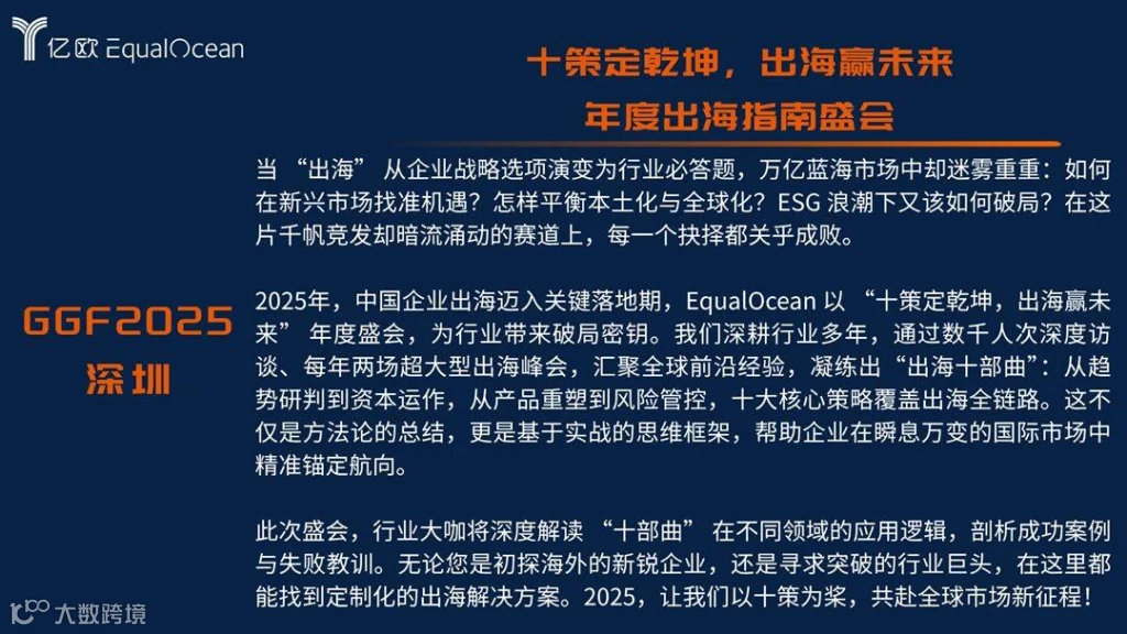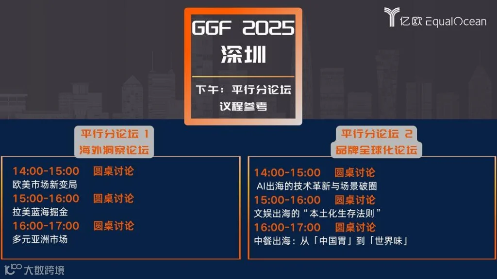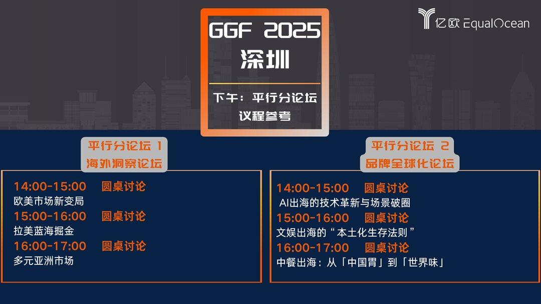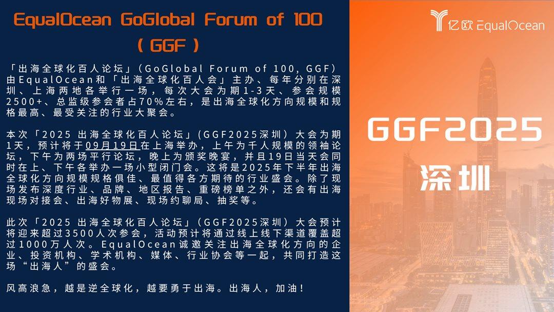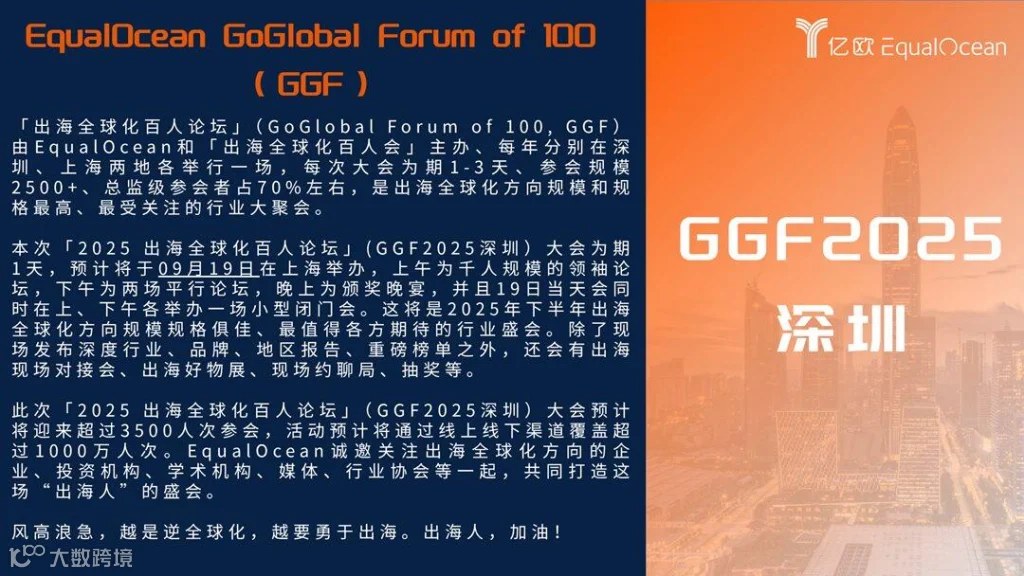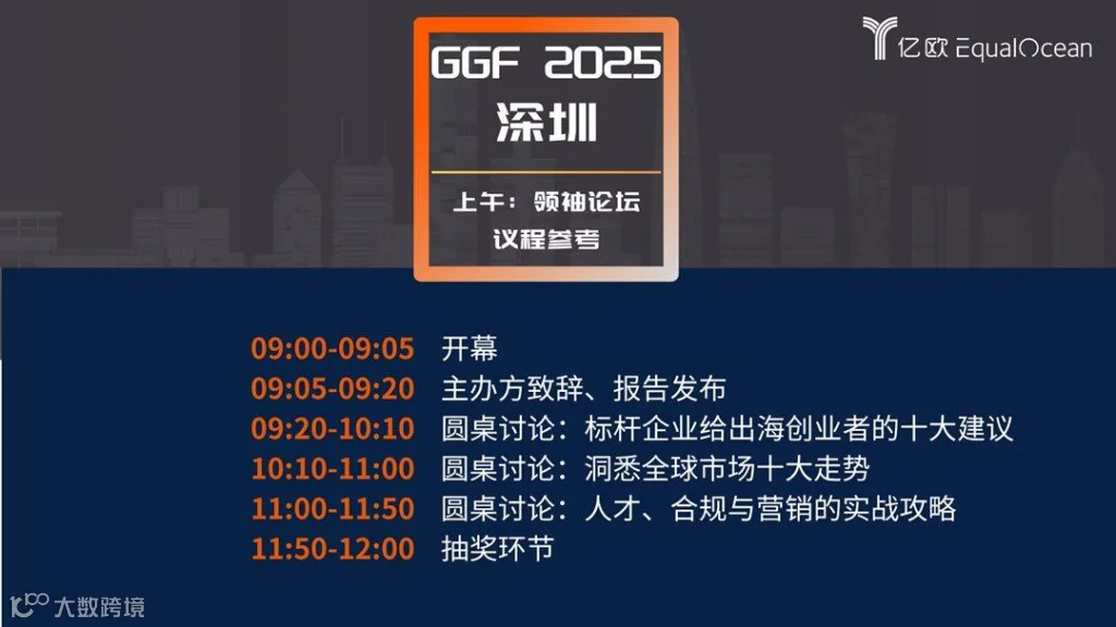 说明:**需:为主办方提供赞助、资源、权益置换等活动支持;审核通过制** *限量:50张* 含: 1. 普通观众臂贴; 2. 会场普通观众坐席; 3. GGF2025深圳观众群; 4. 最新出海行业、品牌、地区报告;