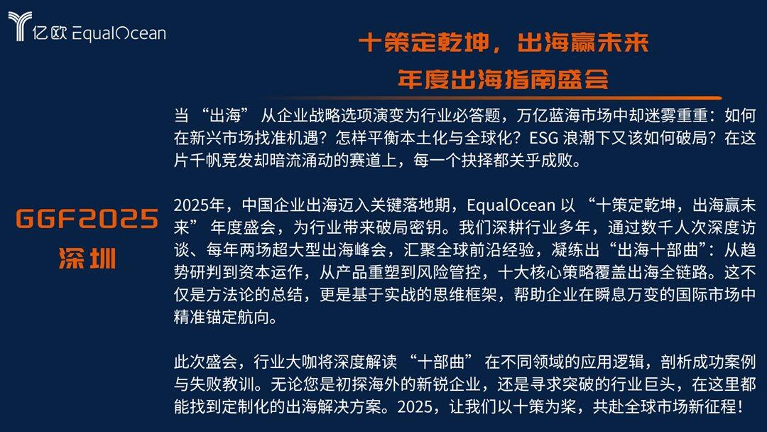 说明:含: 1. SVIP标识邀请卡; 2. 专属入场签到通道; 3. 颁奖晚宴入场资格(一人次); 4. 会场SVIP坐席; 5. 会场自助午餐; 6. VIP专属社群; 7. GGF2025深圳观众群; 8. 最新出海行业、品牌、地区报告; 9. GGF2025深圳回顾集锦。;