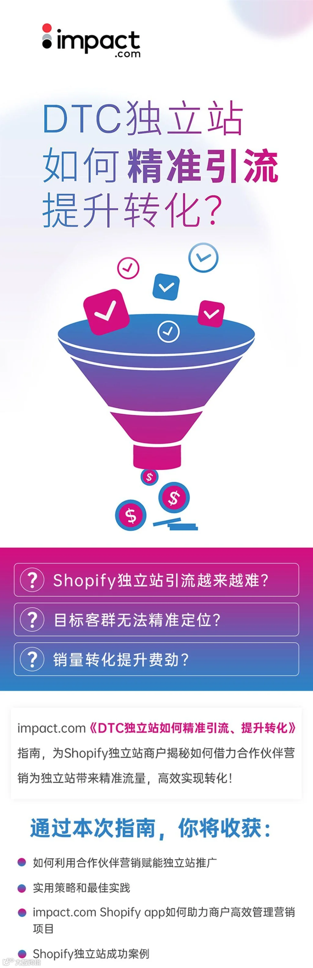 impact.com《DTC独立站如何精准引流、提升转化》指南,为Shopify独立站商户揭秘如何借力合作伙伴营销为独立站带来精准流量,高效实现转化!