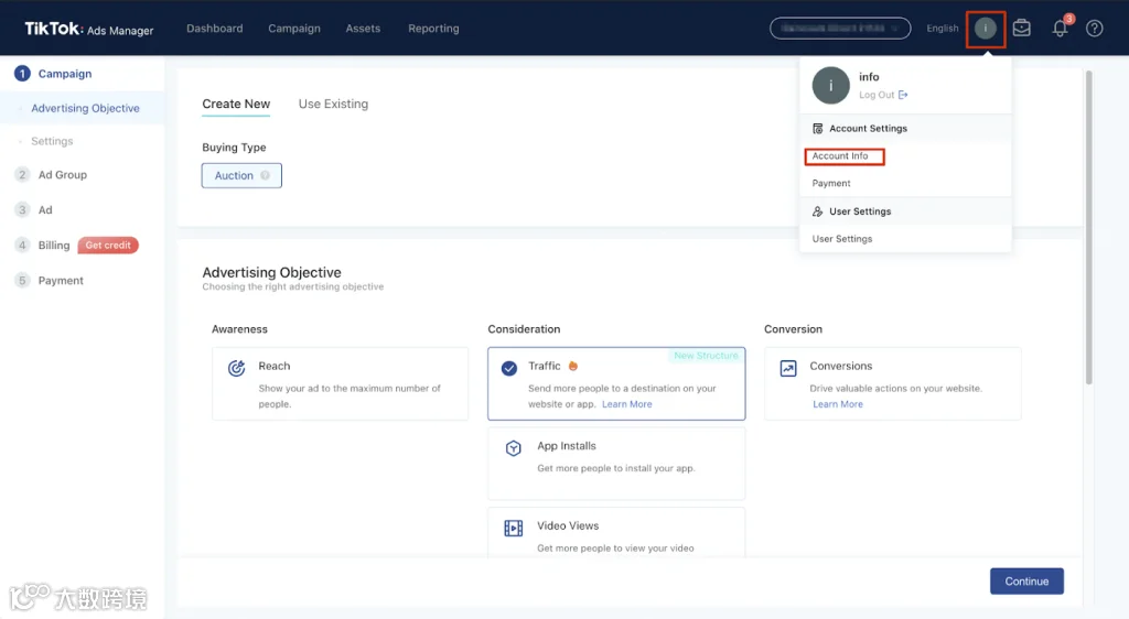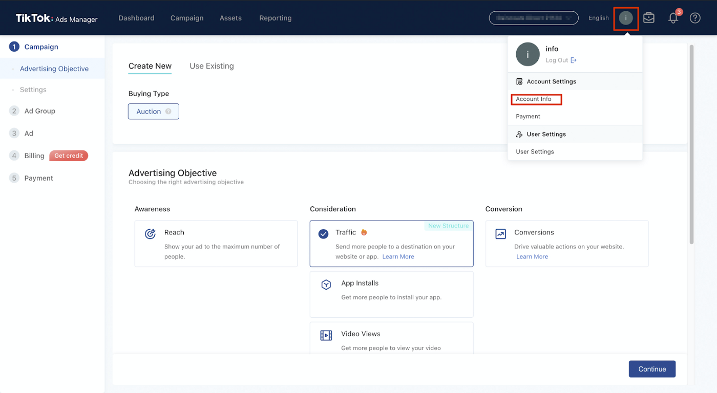 在TikTok 广告管理器的仪表板中,单击“帐户设置”下的“帐户信息”。