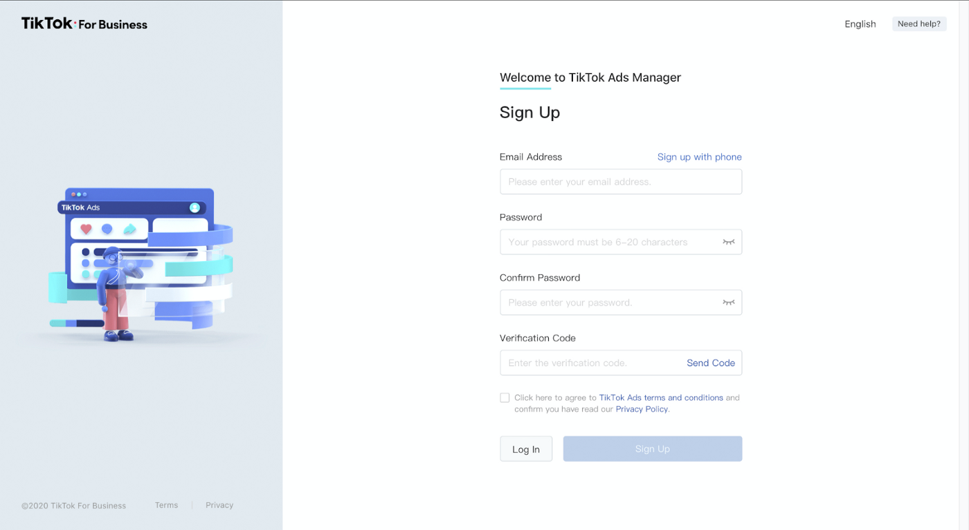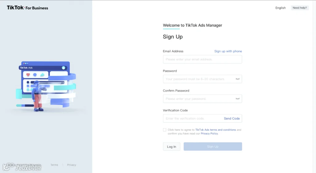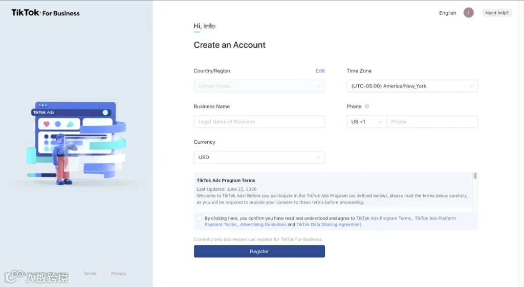 访问TikTok 广告管理器并使用你的电子邮件、地址或电话号码创建 TikTok 广告账户,同意 TikTok 广告条款和条件,然后单击“注册”。