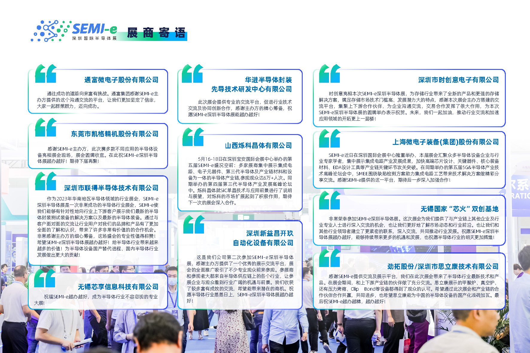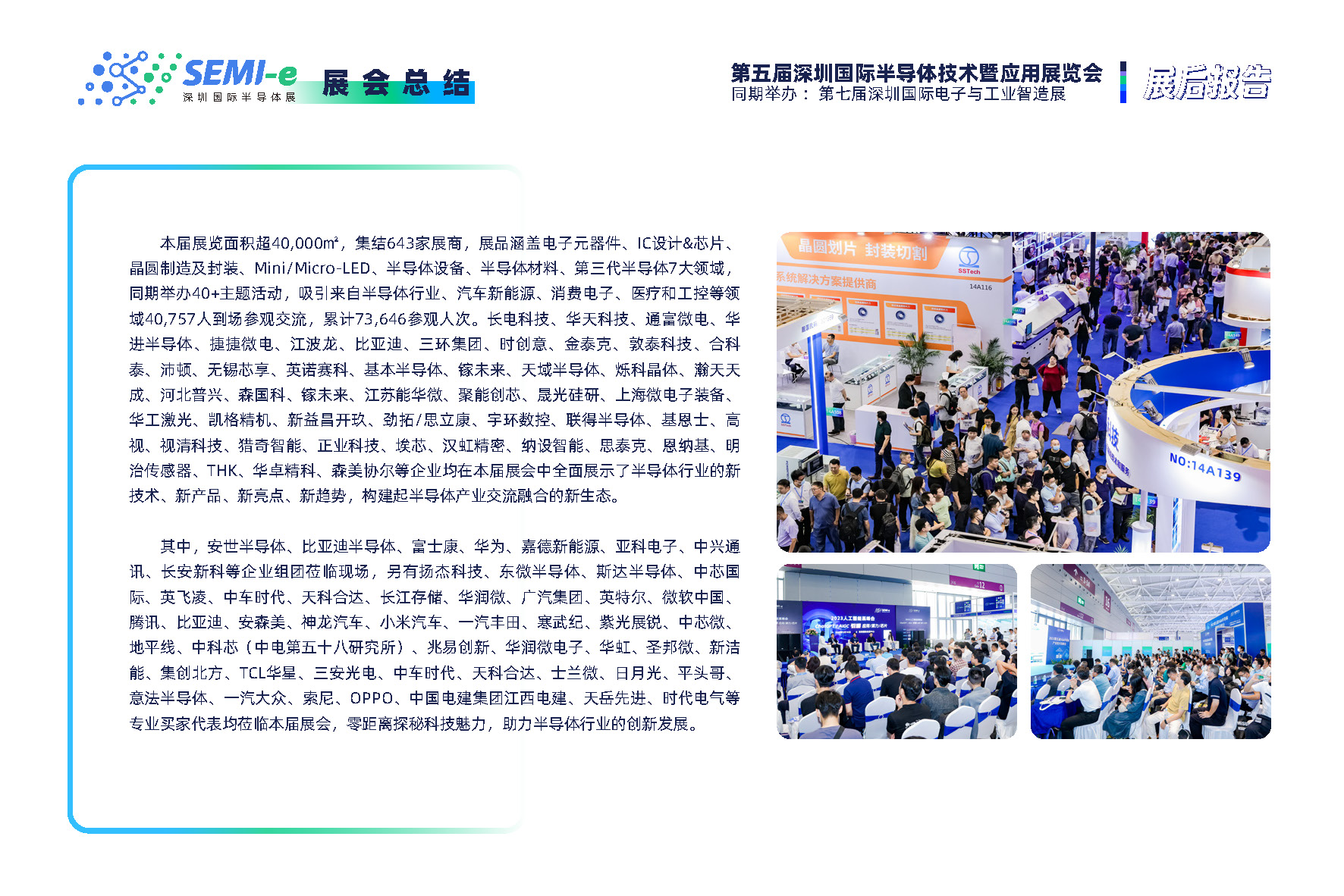 深圳国际半导体及显示技术展(SEMI-e)以 ”芯机会·智未来” 为主题, 汇票众多行业青章和学者, 温-步加强全球集成电路产业的交流与合作, 围绕中国国际集成电圃产业与应用, 立足嚣’II、辐射全国, 旨在集中展示集成电路产业发展成果, 加快南端芯片设计、英键器件、核心提备树料、EDA设计工具等产业链提键环节政吴突破, 加强珠三角产业锺协作, 逐步形成综合性集成电自产业集群, 打遍华南集成电路产业交流与贸易平台,推动华南集成电画产业集震区更快更好发展。