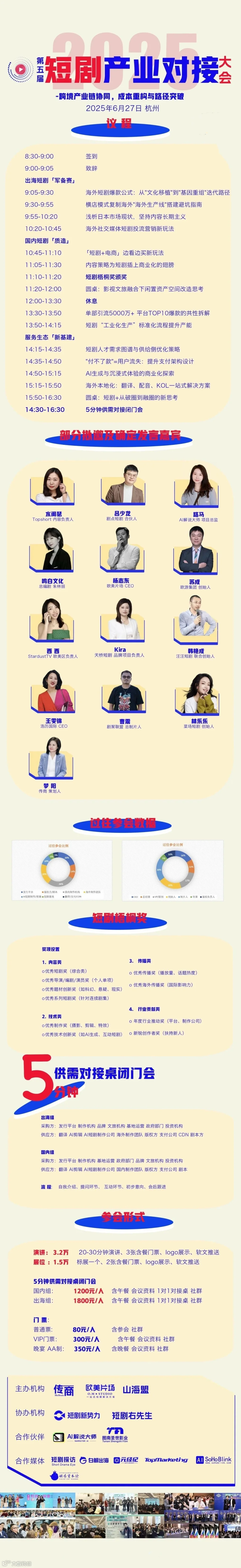 由传商、欧美片场、山海盟主办,短剧新势力、短剧右先生协办的第五届短剧产业对接大会将于2025年6月27日在杭州隆重举行。本届大会以“-跨境产业链协同,成本重构与路径突破”为主题,汇聚平台方、制作机构、技术服务商、支付机构、翻译公司、投资方等全产业链核心参与者,打造集行业洞察、资源对接、奖项表彰于一体交流盛会,助力短剧产业生态升级共话短剧行业未来。