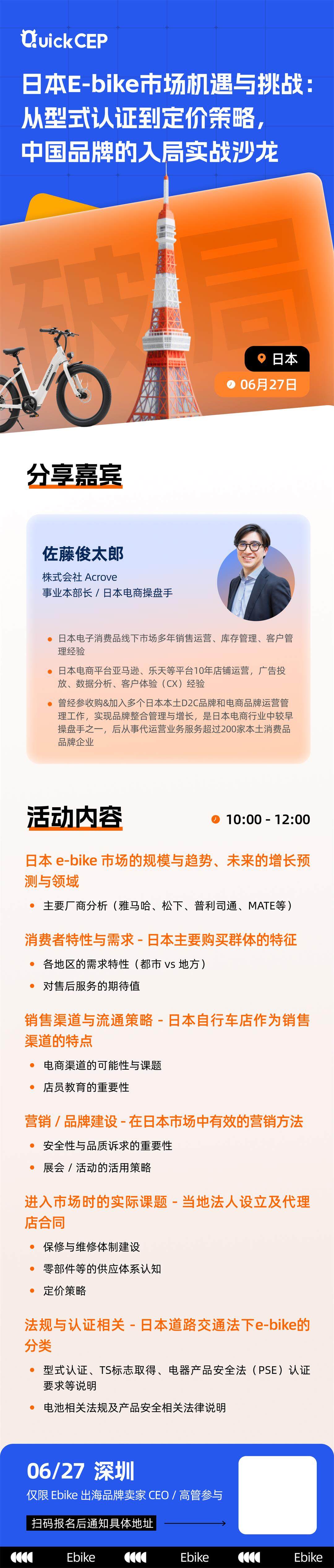 中国电商出海日本专场:日本E-bike市场机遇与挑战:从型式认证到定价策略,中国品牌的入局实战沙龙