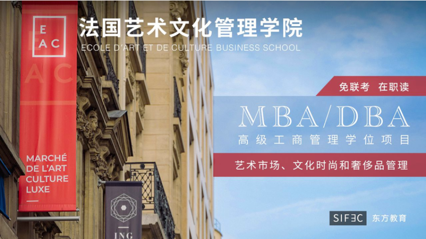 EAC法国艺术文化管理学院(Groupe EAC)于「巴黎」创办。是全球艺术市场管理领域的佼佼者。 在世界公认的「高商专业排名Eduniversal」中长期处于前三,其文凭属于法国「国家级硕士文凭RNCP七级」,受国际企业认可。于2015年来到中国,开设在职MBA、EMBA硕士和DBA博士学位班,第十届学员招生中。