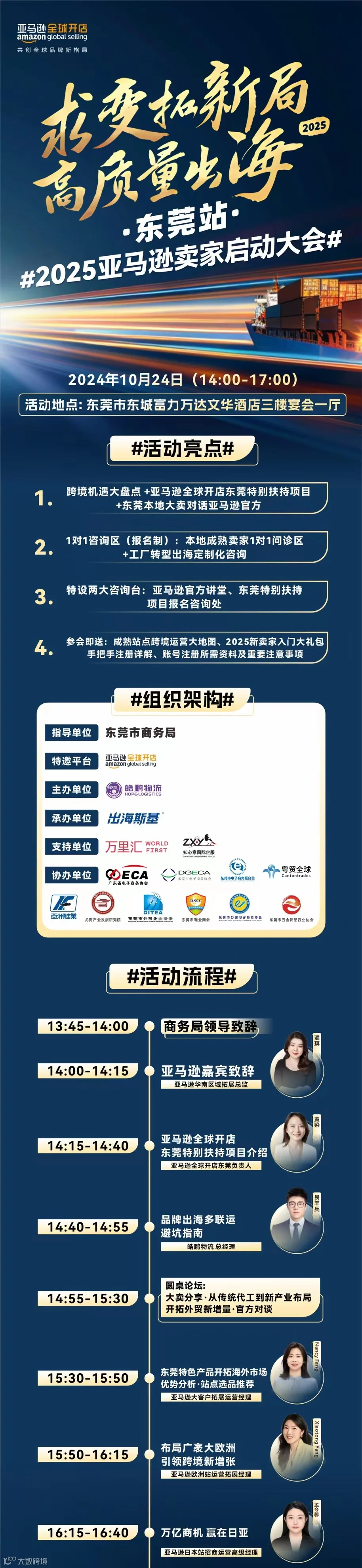 1.亚马逊2025年东莞企业特别扶持项目2.亚马逊平台爆品打造,专业官方运营案例分享3.参会企业高达300+人,卖家与工厂产品采购对接4.签到伴手礼,抽奖环节等您来拿