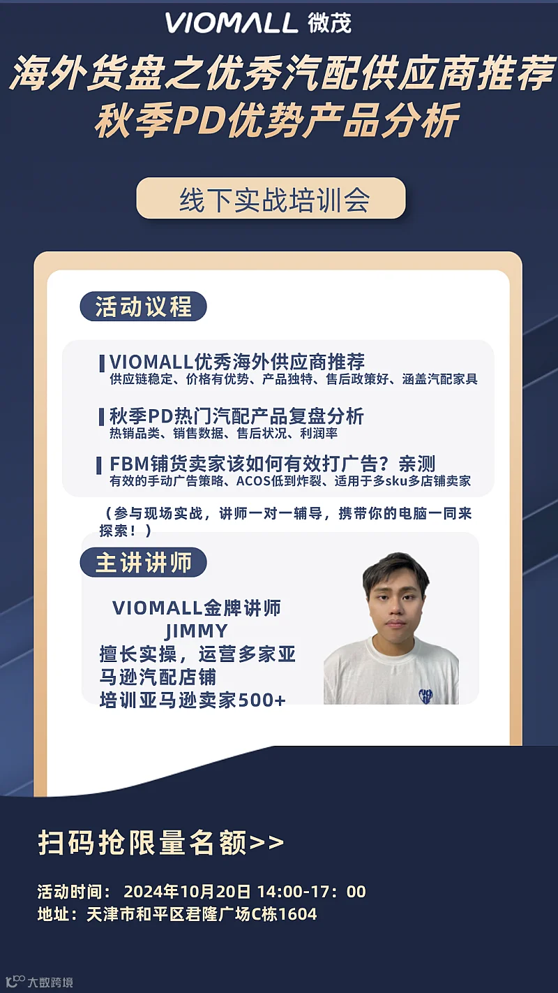 主讲讲师VIOMALL金牌讲师JIMMY擅长实操,运营多家亚马逊汽配店铺培训亚马逊卖家500+