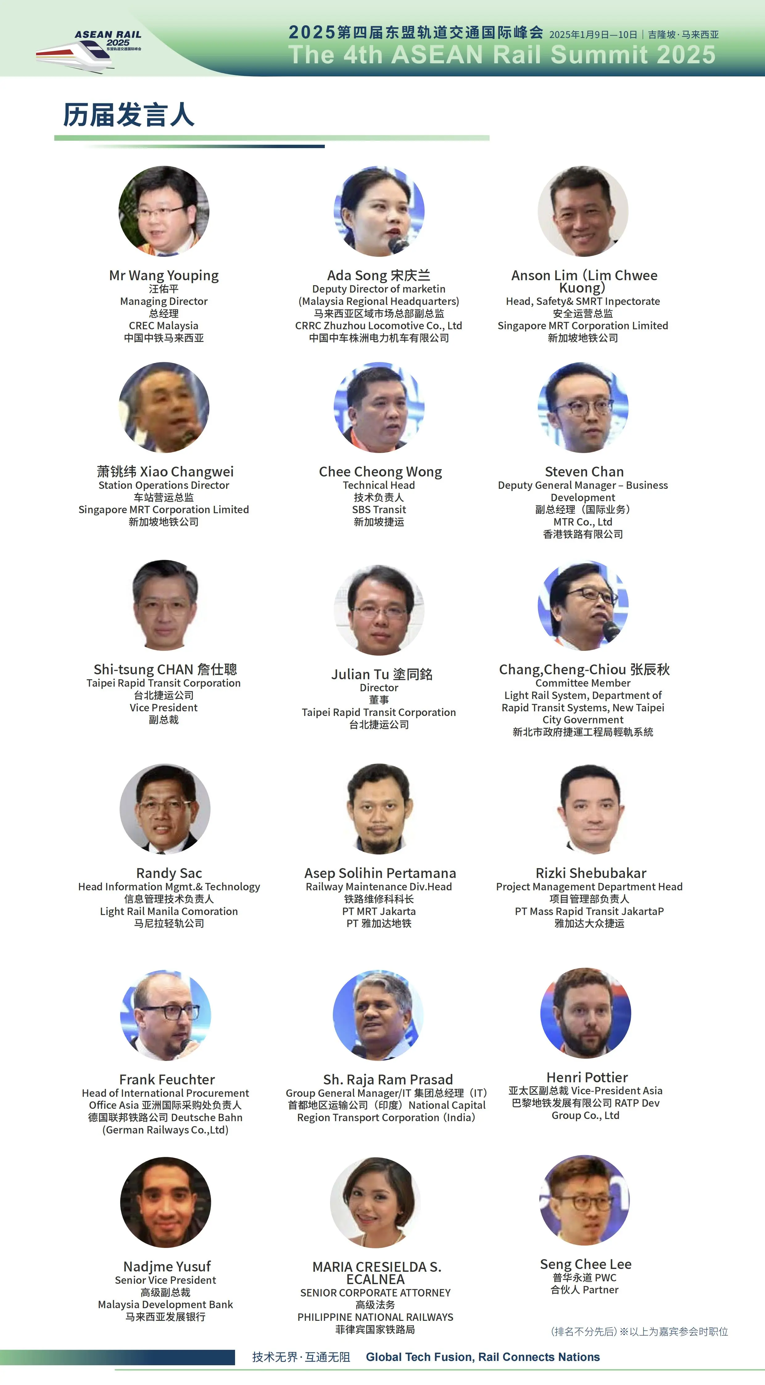 在此背景下,以“技术无界,互通无阻”为主题的2025(第四届)东盟轨道交通国际峰会将于2025年1月9日—10日在马来西亚吉隆坡隆重召开。届时,300多名来自全球各国的铁路政府机构、工程规划设计建设施工单位、业主企业、机车车辆、通信信号、机电安防设备供应商、投融资机构、律所咨询公司的行业专家和决策领导者将共聚一堂,聚焦东盟轨交产业发展机会、标准化建设、投融资前景、建设工程以及运营维保等主题展开讨论,共同推进东盟轨道交通的行业建设和发展!